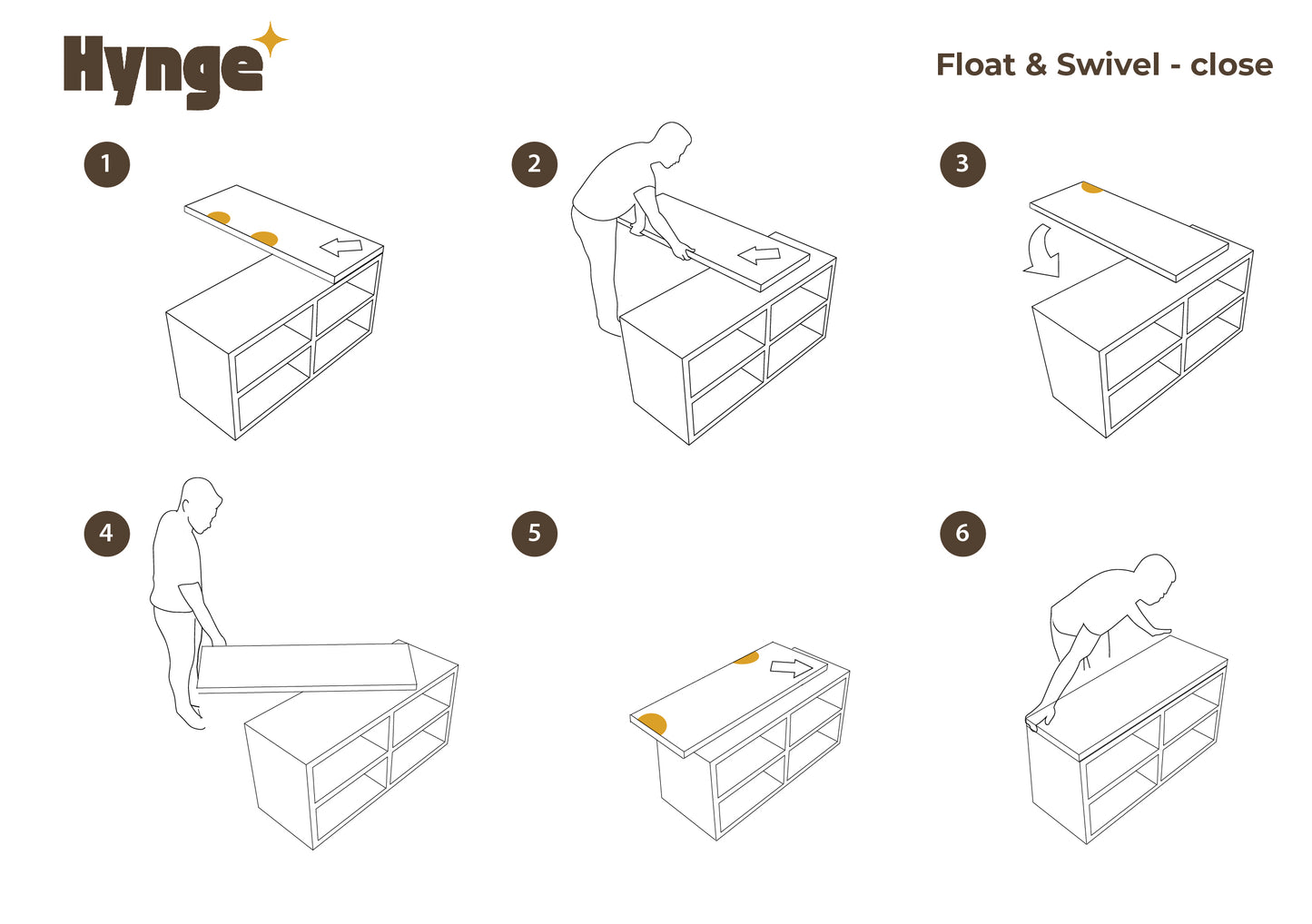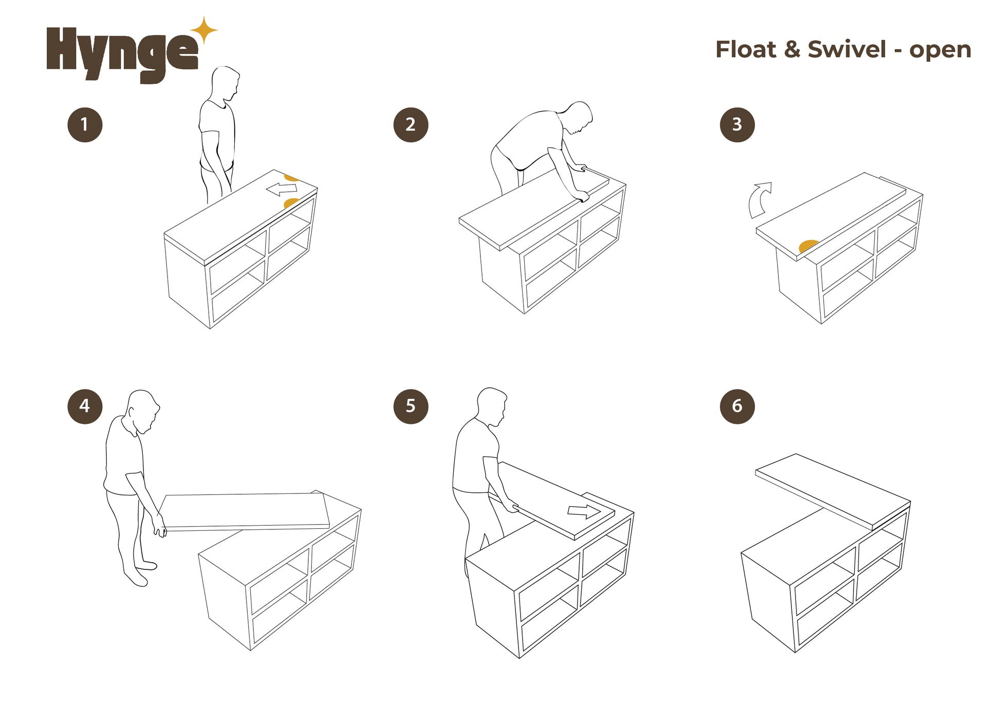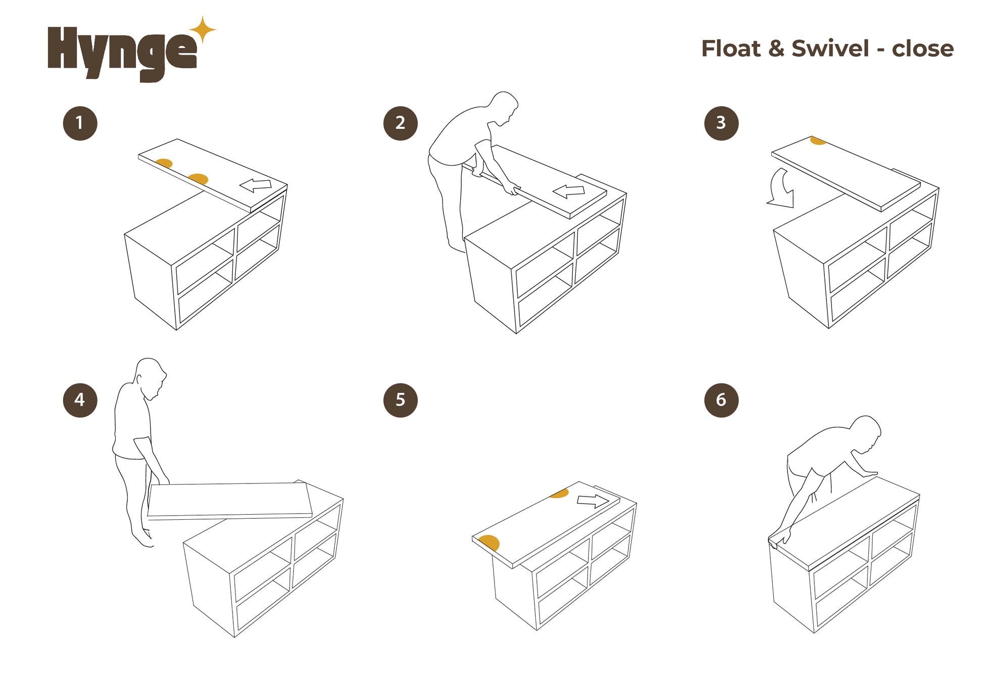 Our Float & Swivel product offers a specific functional design. It allows the rotation of a work desk or bench on top of a stationary furniture element such as a shelf, cupboard, or sideboard, floating freely without a supporting side leg.