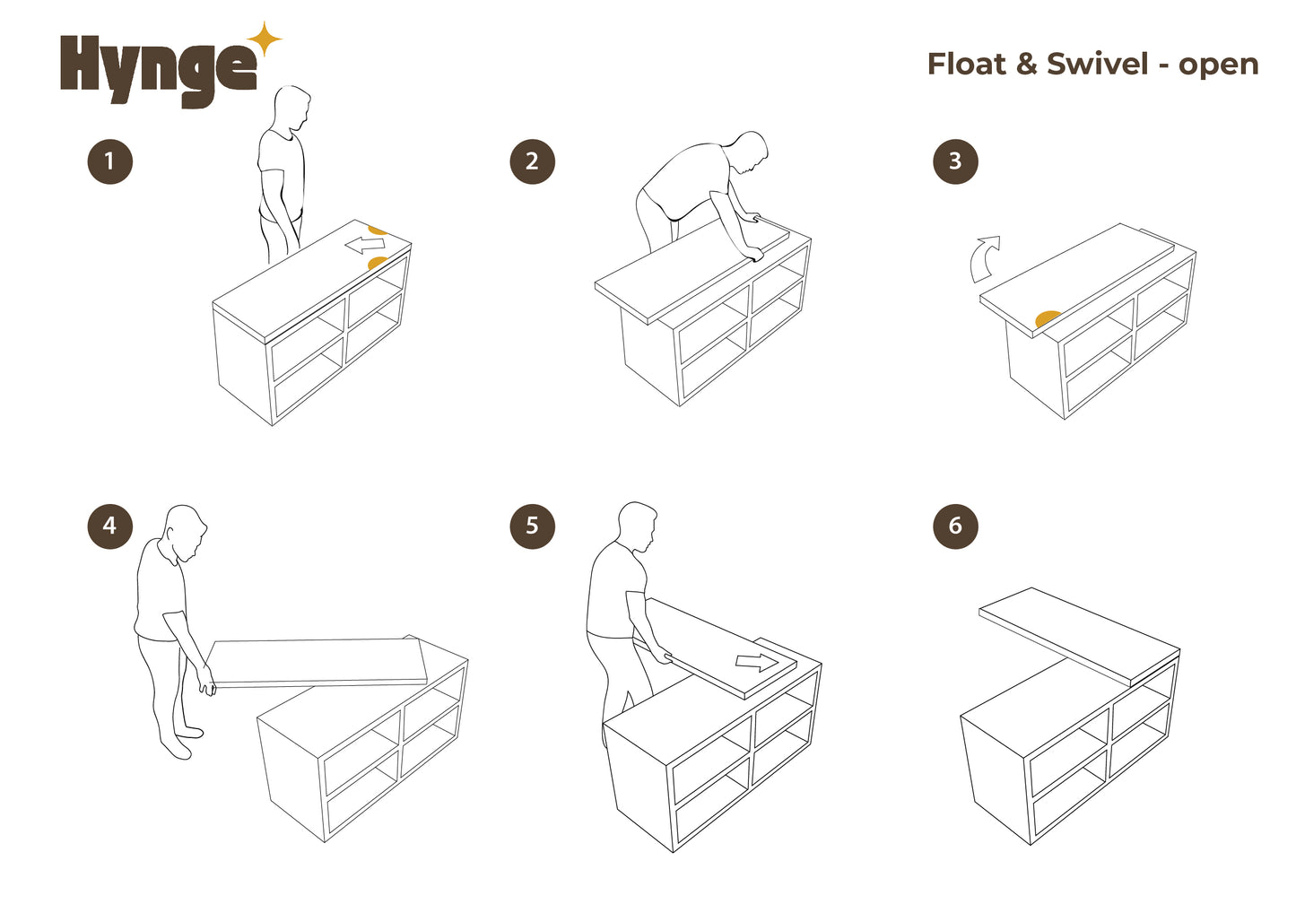 With our unique pull-turn-push movement, the rectangular table or workbench is first moved away from obstructing walls, then rotated by 90 degrees and moved to the final open position for usage. And this is how your kitchen or work space can easily be expanded. When not in use, your desk or bench can be stowed away easily with our simple pull-turn-push move.