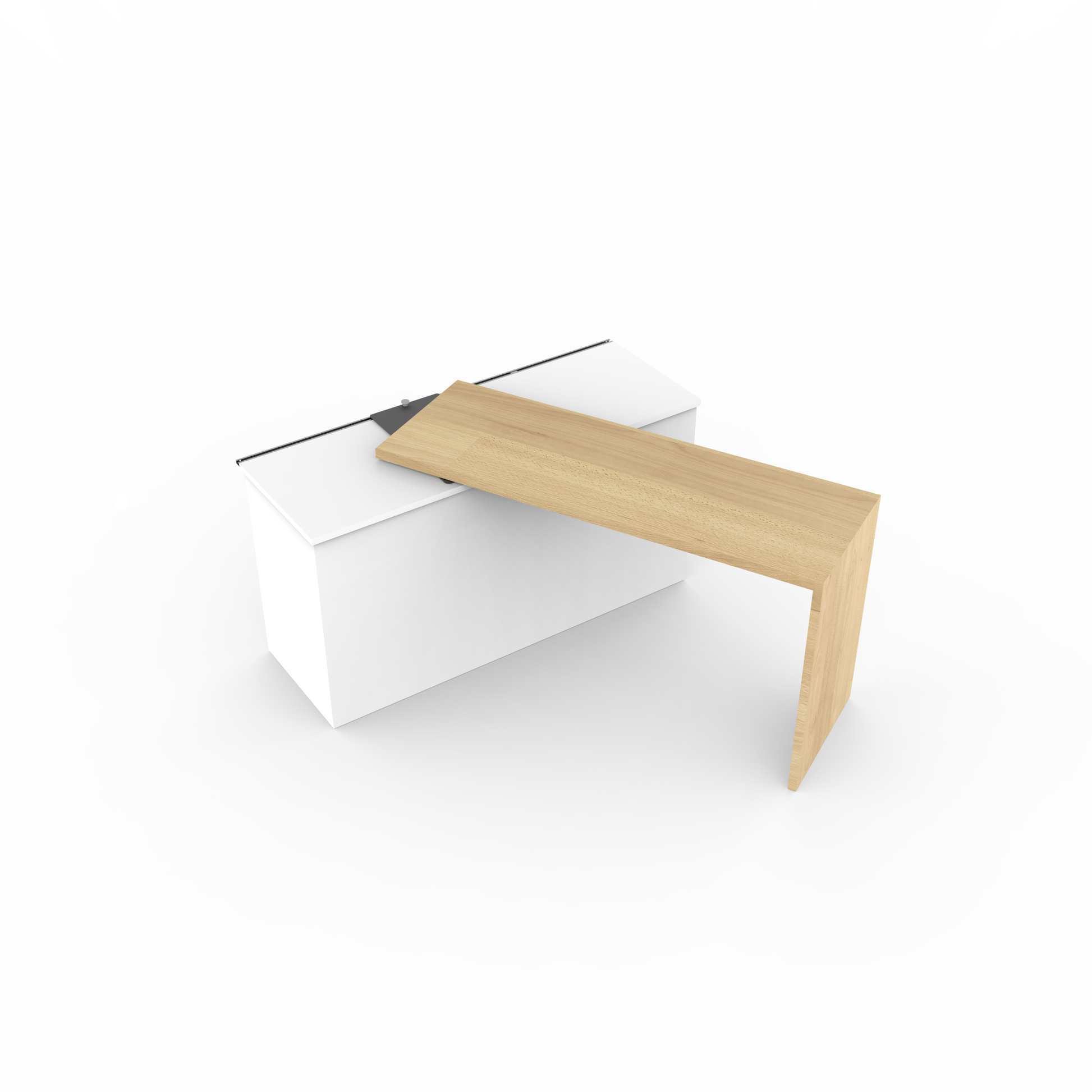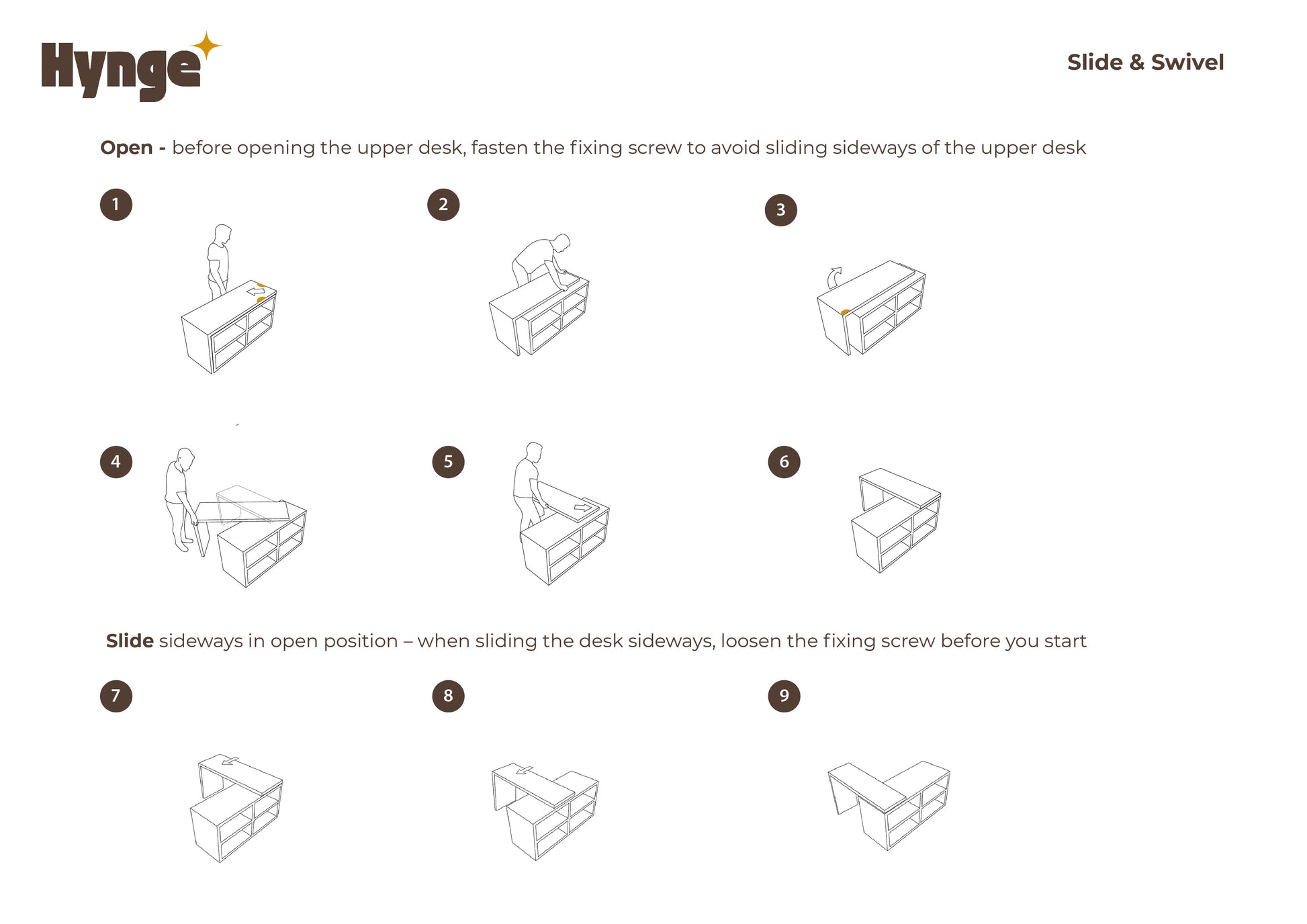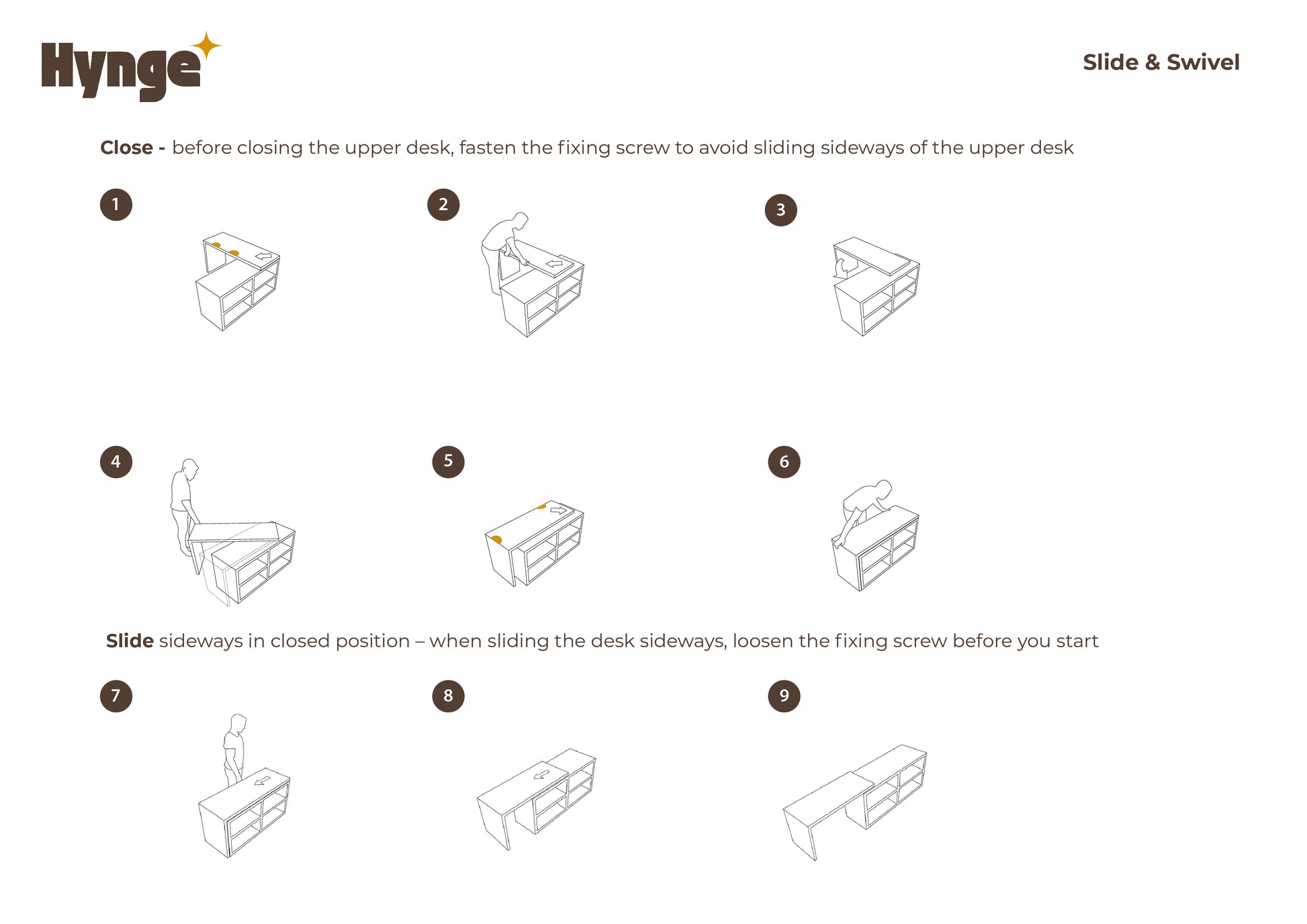 Aus der geschlossenen Position lässt sich der obere bewegliche Tisch oder die Küchentheke seitlich verschieben, um neben dem feststehenden Möbel einen Arbeitsbereich zu schaffen. In jeder beliebigen seitlichen Position kann der rechteckige Tisch oder die Küchentheke mit unserer einzigartigen Pull-Turn-Push Bewegung auch zunächst von einschränkenden Wänden weggeschoben, dann um 90 Grad gedreht und in die offene Position geschoben werden. In der offenen Position kann der Schreibtisch oder die Bank wiederum seitlich entlang des Möbels verschoben werden. Wenn Ihr Schreibtisch oder Ihre Theke nicht verwendet wird, lässt dieser sich mit unserer einfachen Pull-Turn-Push Bewegung oder durch seitliches Verschieben einfach verstauen, je nachdem, in welcher Position der Schreibtisch zuletzt verwendet wurde.