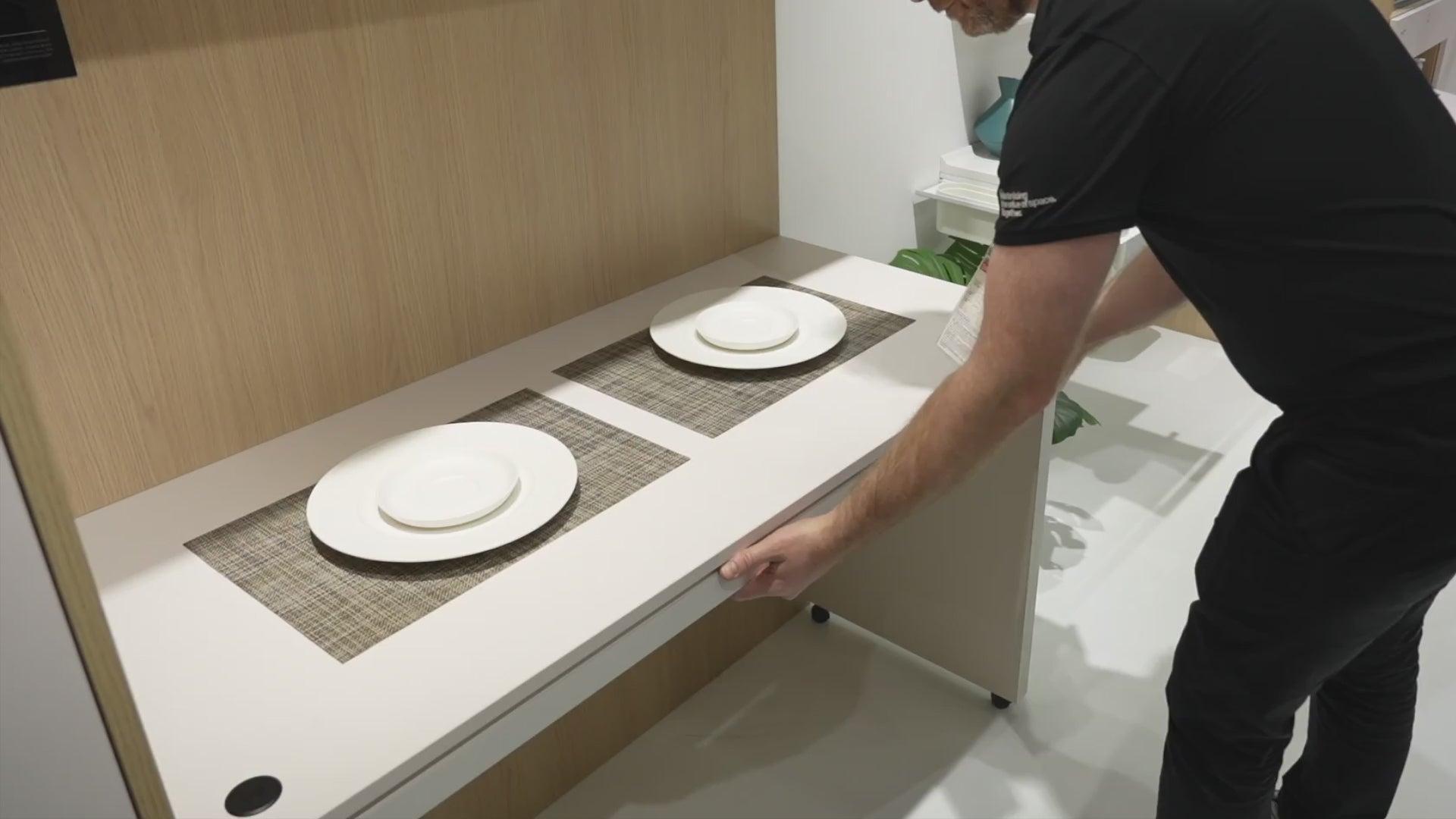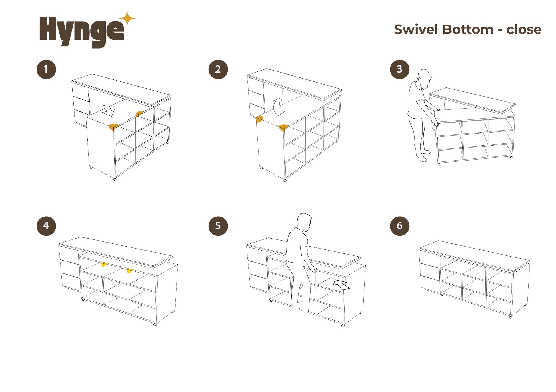 Mit unserer einzigartigen Pull-Turn-Push Bewegung wird das rechteckige Möbelelement zunächst von einschränkenden Wänden wegbewegt, dann um 90 Grad gedreht und in die endgültige, offene Position zur Nutzung geschoben. So lässt sich Ihre Küche oder Ihr Arbeitsraum ganz einfach erweitern. Bei Nichtgebrauch lässt sich Ihr Möbelteil mit unserer einfachen Pull-Turn-Push Bewegung ganz einfach verstauen und wegräumen.